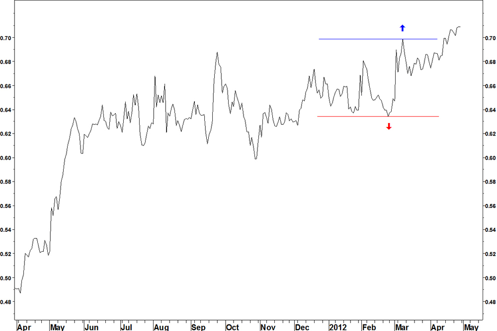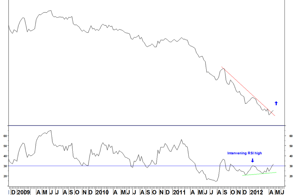Last week, I stated the stop loss as a move back into oversold on the weekly RSI or a weekly reversal. Some people will prefer a fixed stop loss, which would be a new low for the ratio below the 05 April low. That is 10.1% lower.