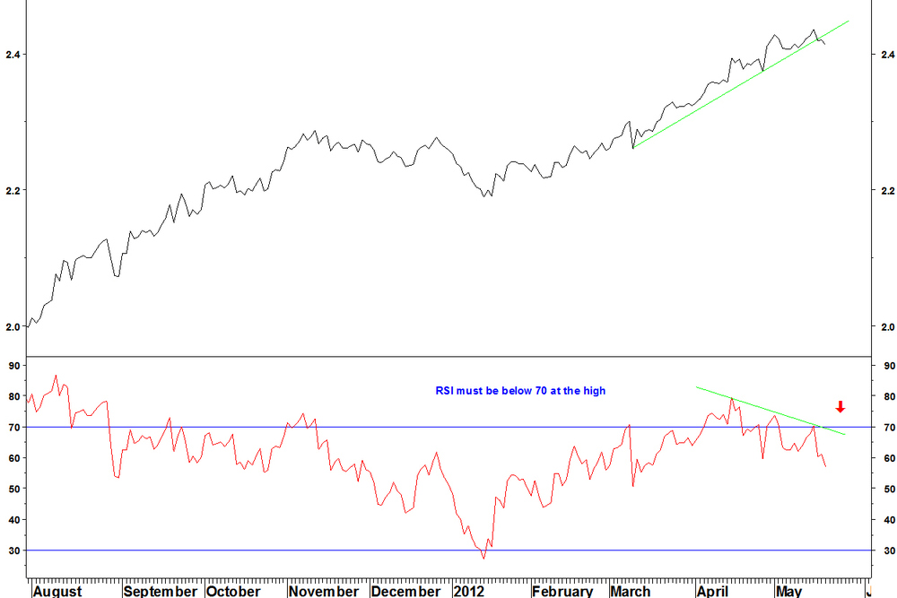 - The requirement is a new high with a daily RSI divergence below 70. That has yet to form