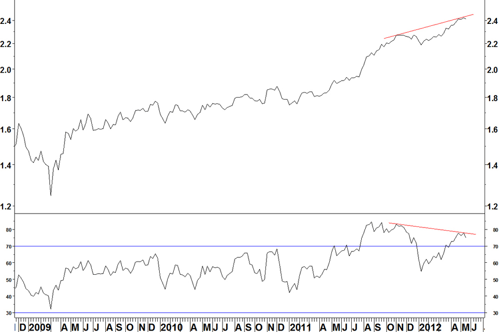 - The weekly chart shows a long term uptrend but an RSI divergence against the 2011 high