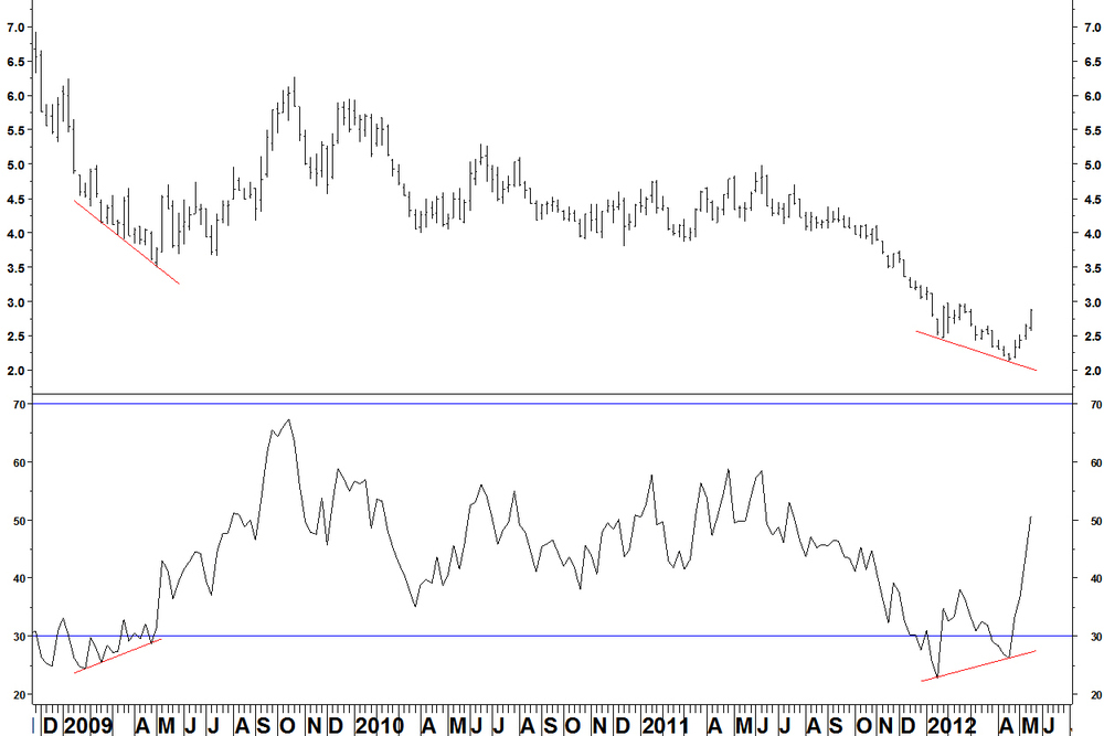 The bullish RSI divergence on Natural Gas resulted in some upside but none of the stock pairs that I showed with it set up correctly. There is still the chance that some might but that would then be less to do with natural gas and more due to a short term broader commodity stock rebound.