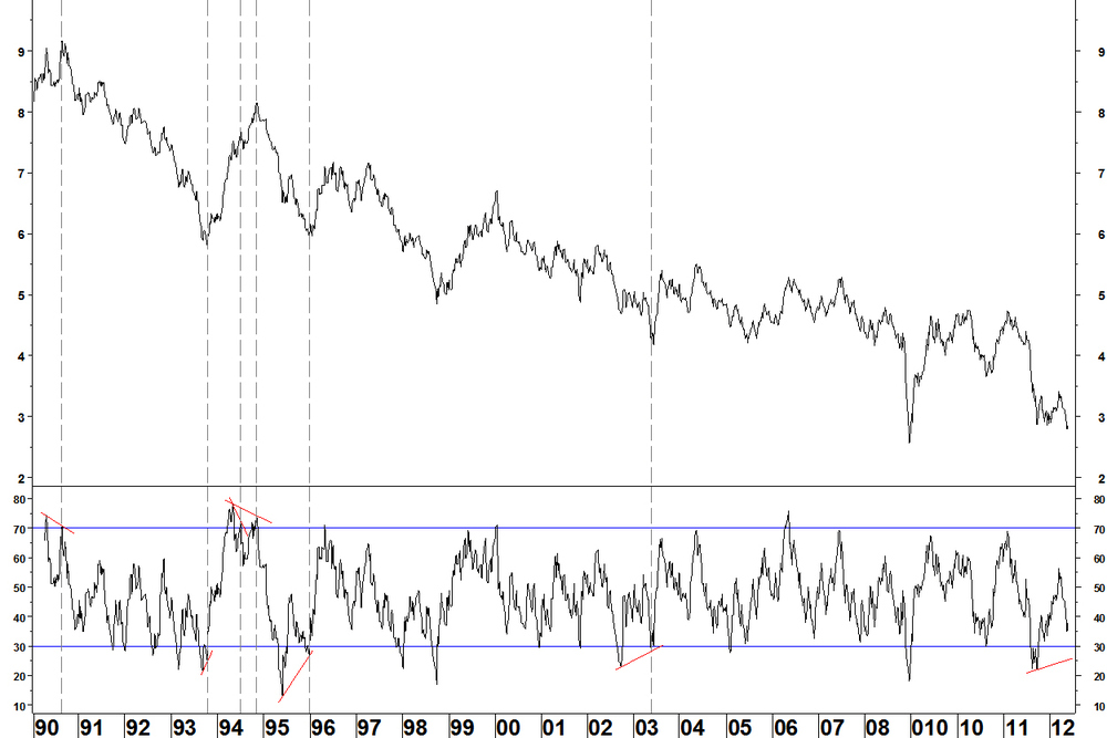 Regarding my daily RSI criteria, I cannot be so exacting as with stocks to insist on a daily divergence that is above 30, after all, there are not hundreds of yield charts to choose from. Main points- Weekly divergences are rare, with a good record of at least halting a move and often reversing it
