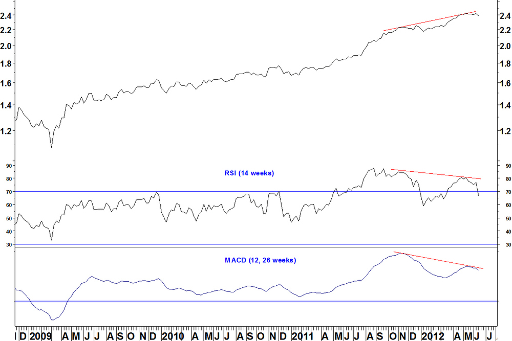 The pair was shown making a bearish weekly RSI divergence. There was also a bearish MACD divergence (12 and 26 weeks are the parameters).