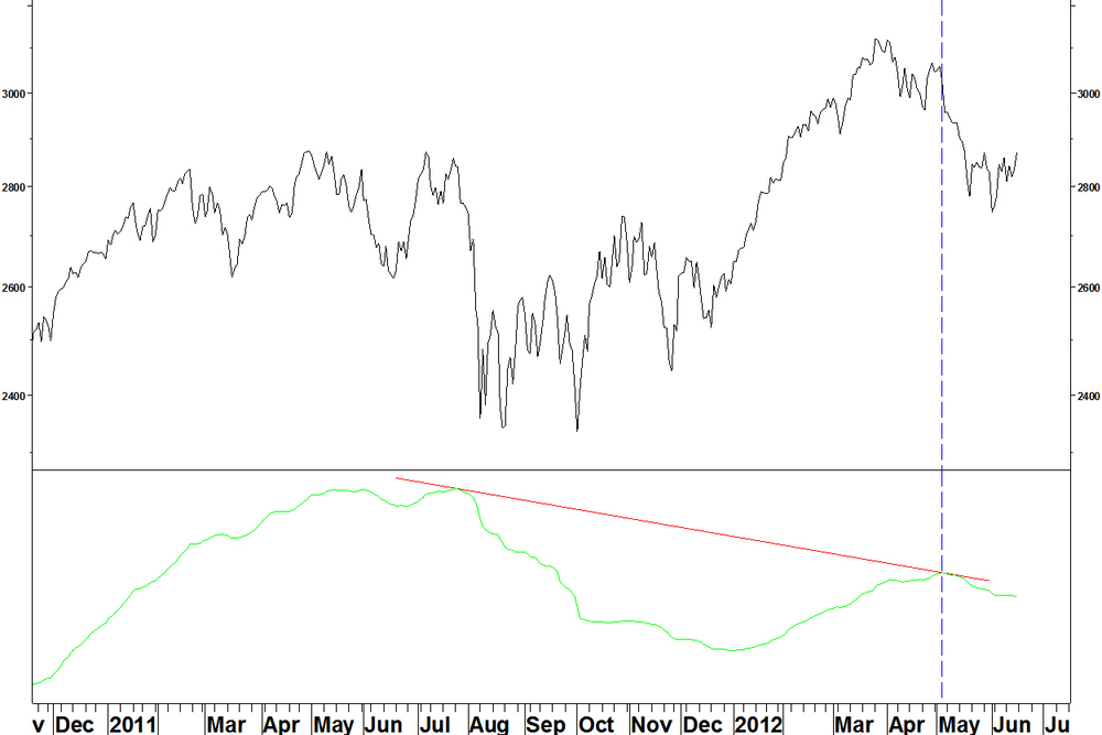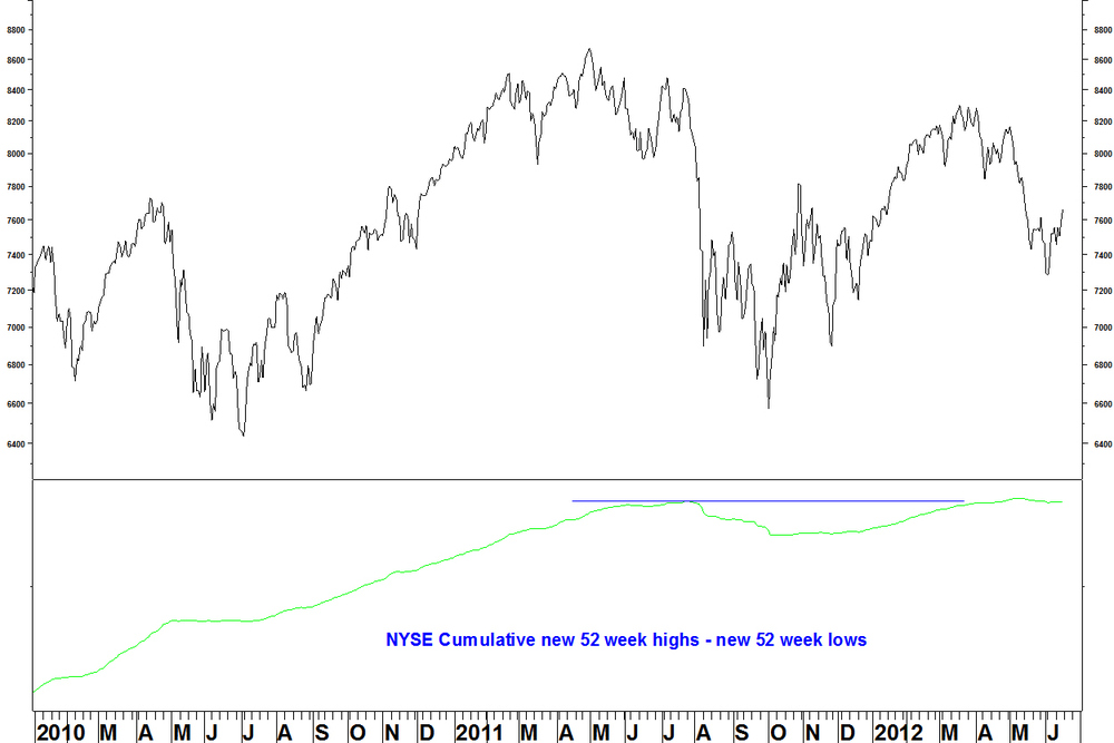 Now compare with the NYSE new highs / new lows data. NYSE Composite Index and cumulative daily new highs / new lows- This spring, the breadth indicator broke above the summer 2011 high despite the index not breaking that high