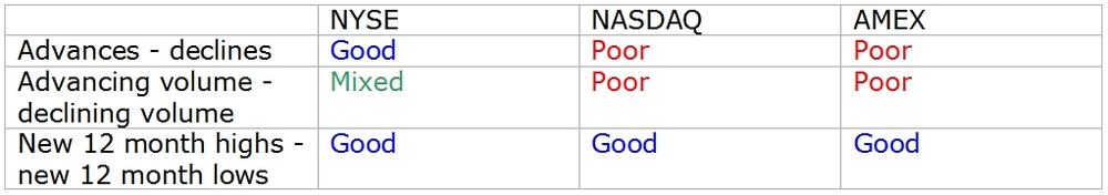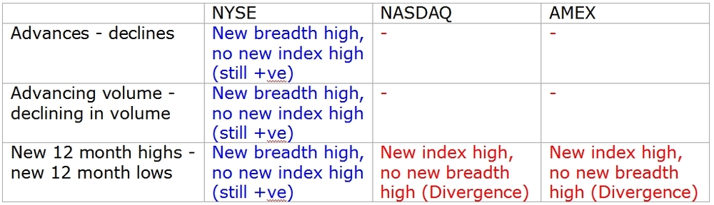 Why is the NYSE breadth data positive, actually showing breadth moving ahead of price, whilst the NASDAQ and AMEX breadth data (highs minus lows) shows divergences?
