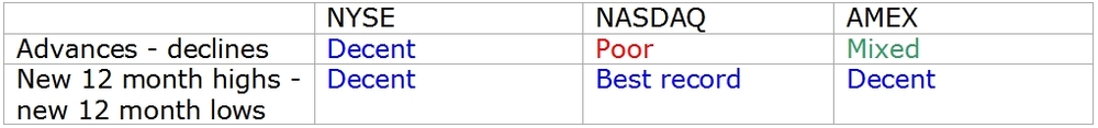 - Countering this, the NYSE and AMEX advance/ decline series, which have decent and mixed records respectively are still positive. There is no divergence