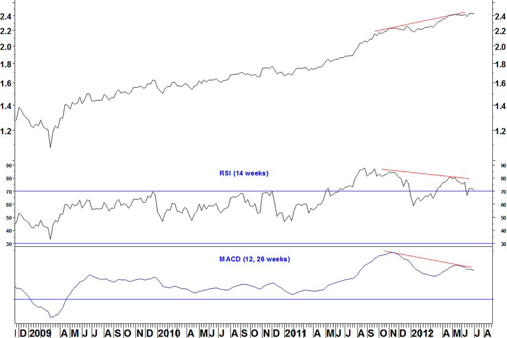This gave a false signal a few weeks ago you may recall but the new high gives another bearish weekly RSI divergence.The daily chart now has a new high with the RSI below 70. Another entry signal could be below the blue line or even below the 18 June low.