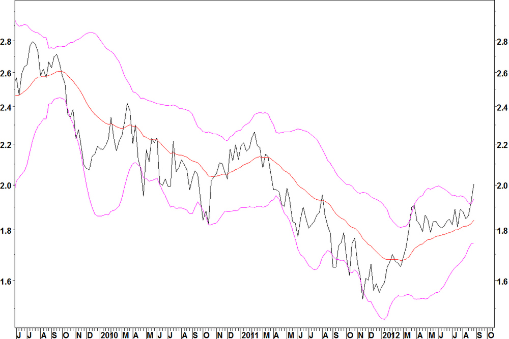 - The ratio broke above the upper band in week ending 24 August