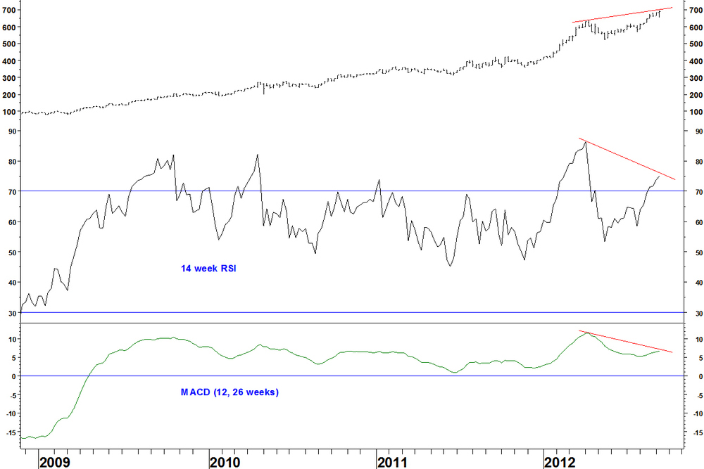 Apple (AAPL) has been an important contributor to the bull market since early 2009, as it has become the largest US stock and has become the highest market cap stock ever. Now though, Apple beginning to set up according to my RSI divergence criteria. Not every criterion is in place yet but most importantly, the weekly RSI and MACD divergences are in place. Weekly chartPrevious times Apple has set up according to these weekly divergence criteria are: