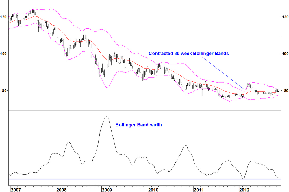 That consolidation has allowed the 30 week Bollinger Bands to contract, close to the level of contraction of February, which preceded a sharp move.