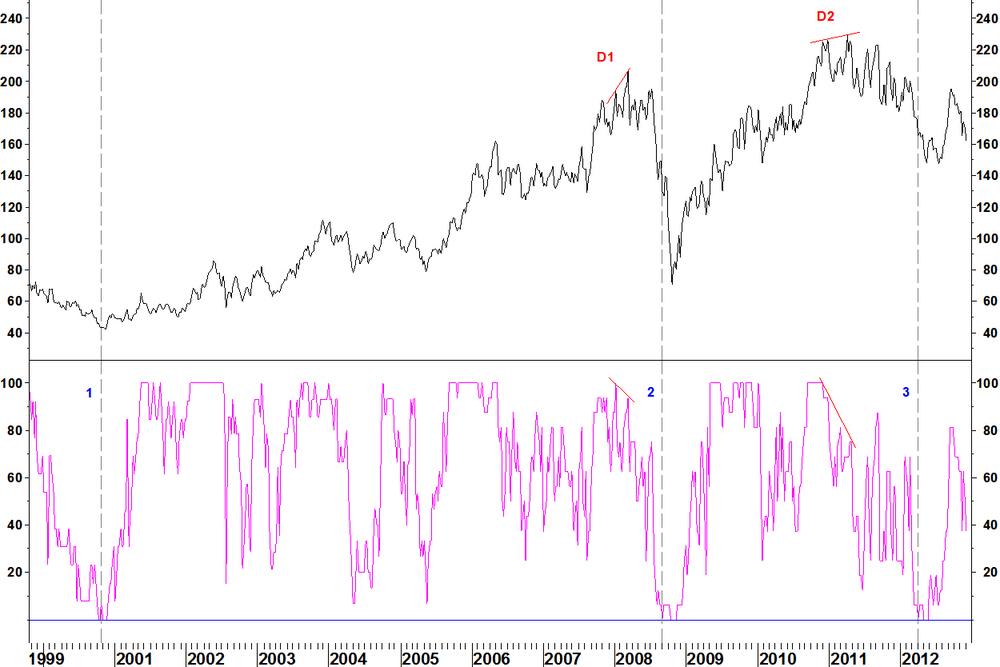 - Breadth divergences mark peaks in March 2008 (D1) and April 2011 (D2)