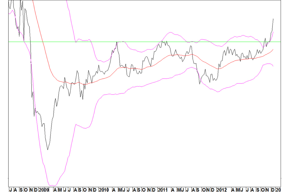 This trade was backed up by an expectation of Yen weakness and by the commonality shown, with other stocks against NTT showing Bollinger Band set ups. From the 19 November posting, the Orix (IX) v NTT ratio has broken above the green, multi year resistance level due to the relative weakness of NTT.Orix (IX) v Nippon Telegraph & Telephone (NTT)