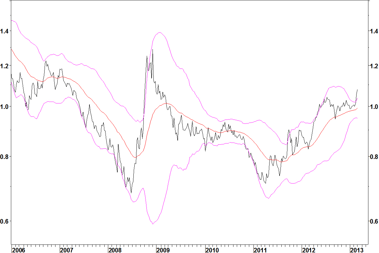 I showed the Morgan Stanley Consumer Index (CMR) v Morgan Stanley Commodity Related Equity Index (CRX) breaking higher from a Bollinger Band contraction. That break continues.