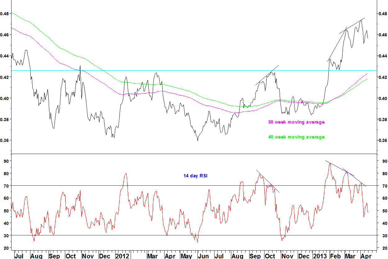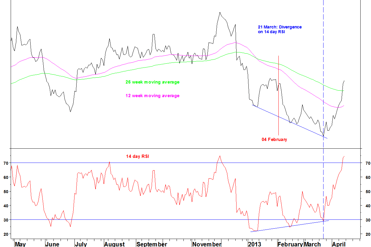 The 14 day RSI however did show divergence in late February, leading to a short term rally, then another divergence at the low on 21 March.