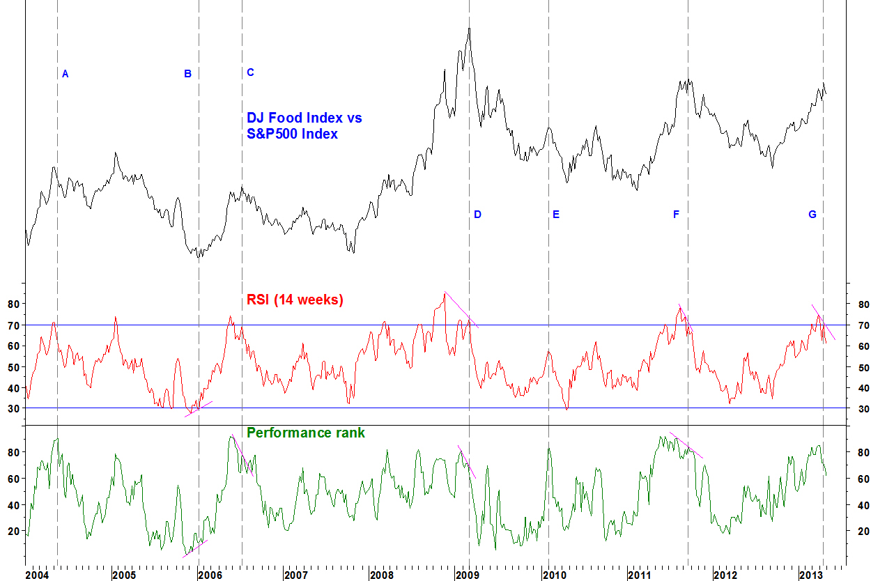 - Being defensive, some relative peaks have corresponded with market index lows (times C, D, F). At G (Apr 13), the sector relative also has bearish RSI divergence