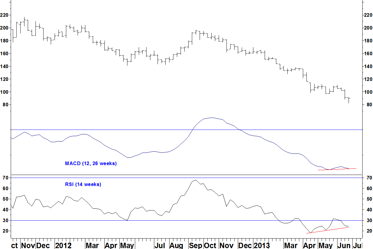 I will open a long position on a weekly close of the RSI above the intervening peak of 31.64 from the week ending 31 May. The stop loss will be a close below the low of 82.29 from 26 June. You could use the Market Vectors Gold Miners (GDX) for this trade.