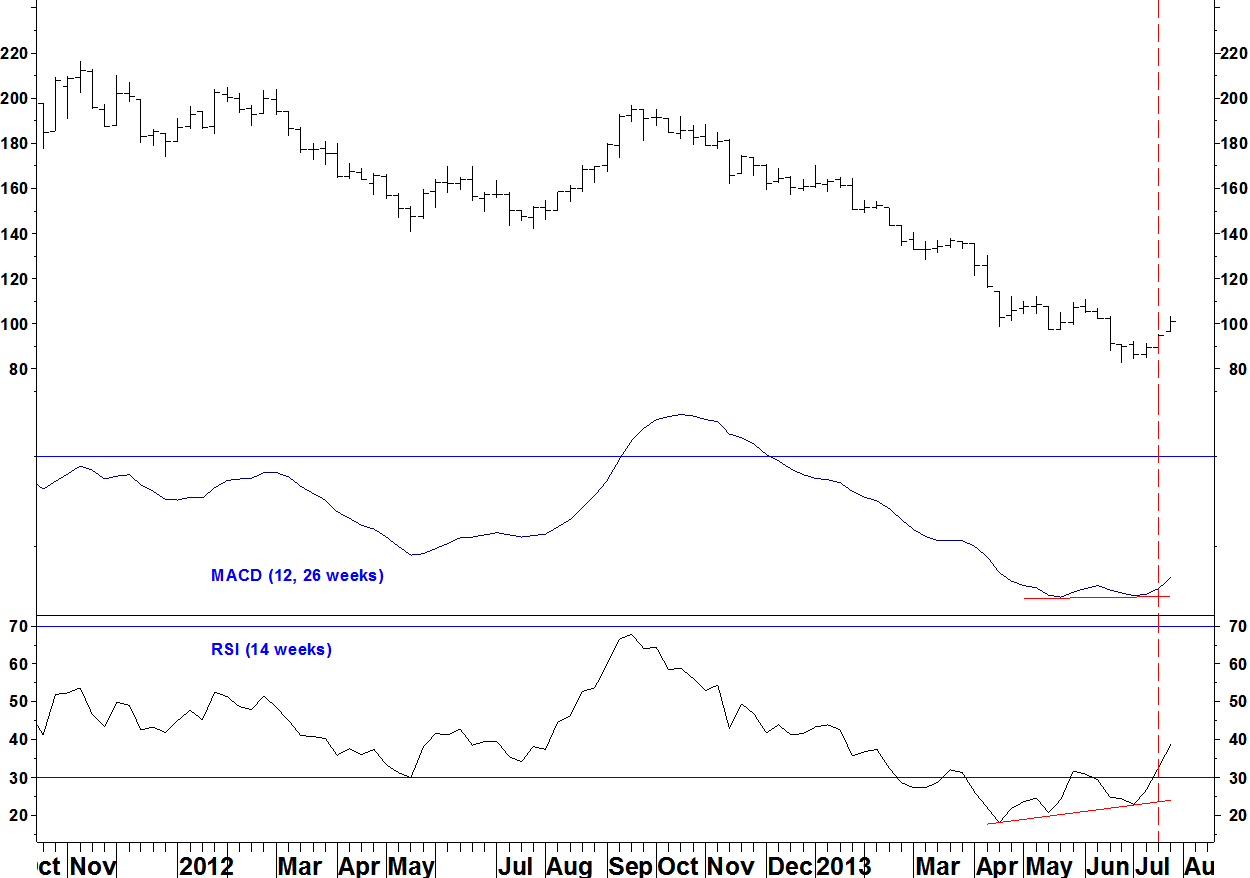 On 01 July, I showed the set up for an RSI divergence buy signal on the Philadelphia Gold & Silver Index (XAU). The buy signal, a weekly RSI close above 31.64 from late May was given on the week ending 19 July.