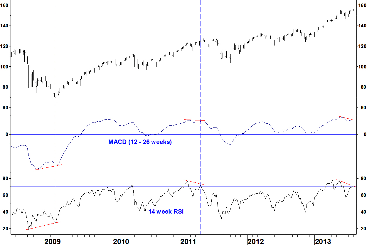 Expect the index to move lower in the next few months but note that the sell off from the April 2011 high came in two stages and most of it within a two week period in early August. These divergence sometimes mark long term turning points, as in 2009 but not always, as in 2011. The S&P500 Index also has this divergence, whereas the small cap and NASDAQ indices do not.