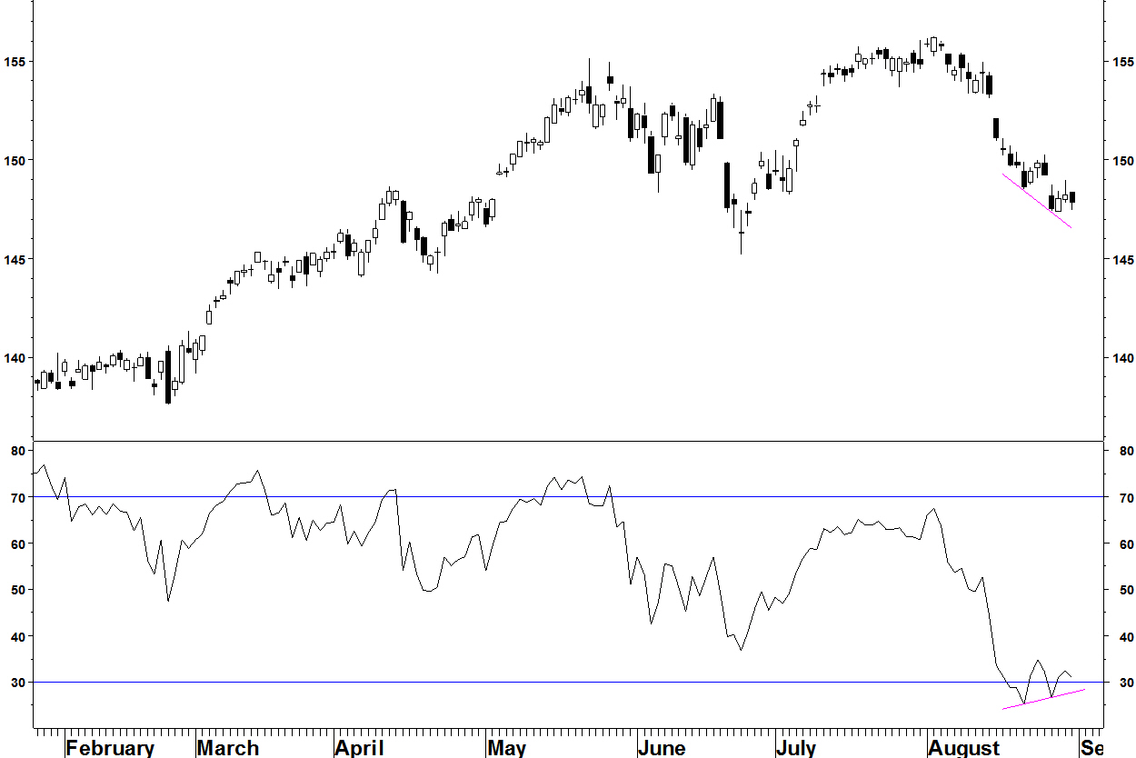 A short position in DIA was opened on 14 August at $153.32. This now has a bullish divergence on its 14 day RSI.