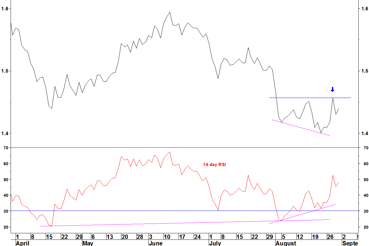 - An RSI buy signal is a move above the intervening RSI high of 39.6 from 19 July (blue arrow)