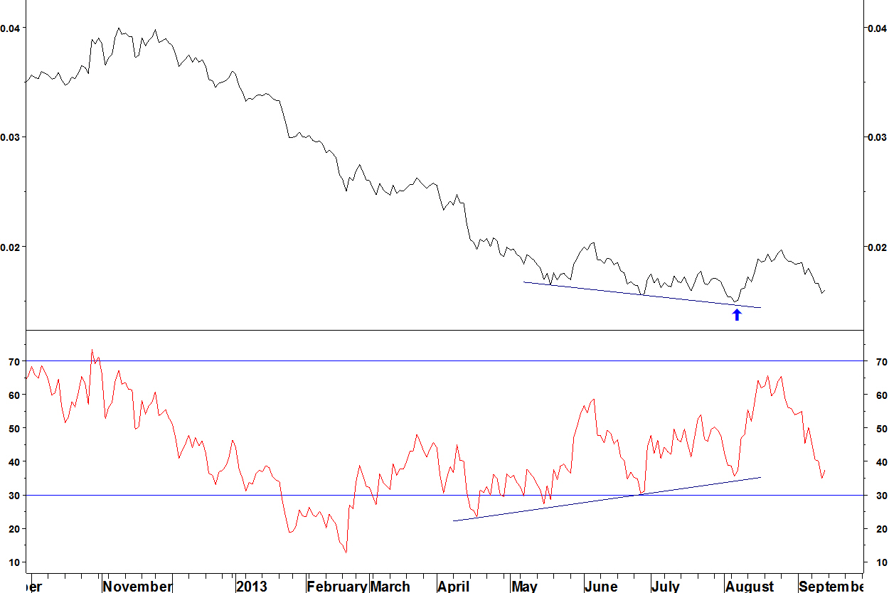 The position still has a chance of working, having not negated its bullish weekly RSI divergence. It has to hold above the 06 August low (blue arrow).