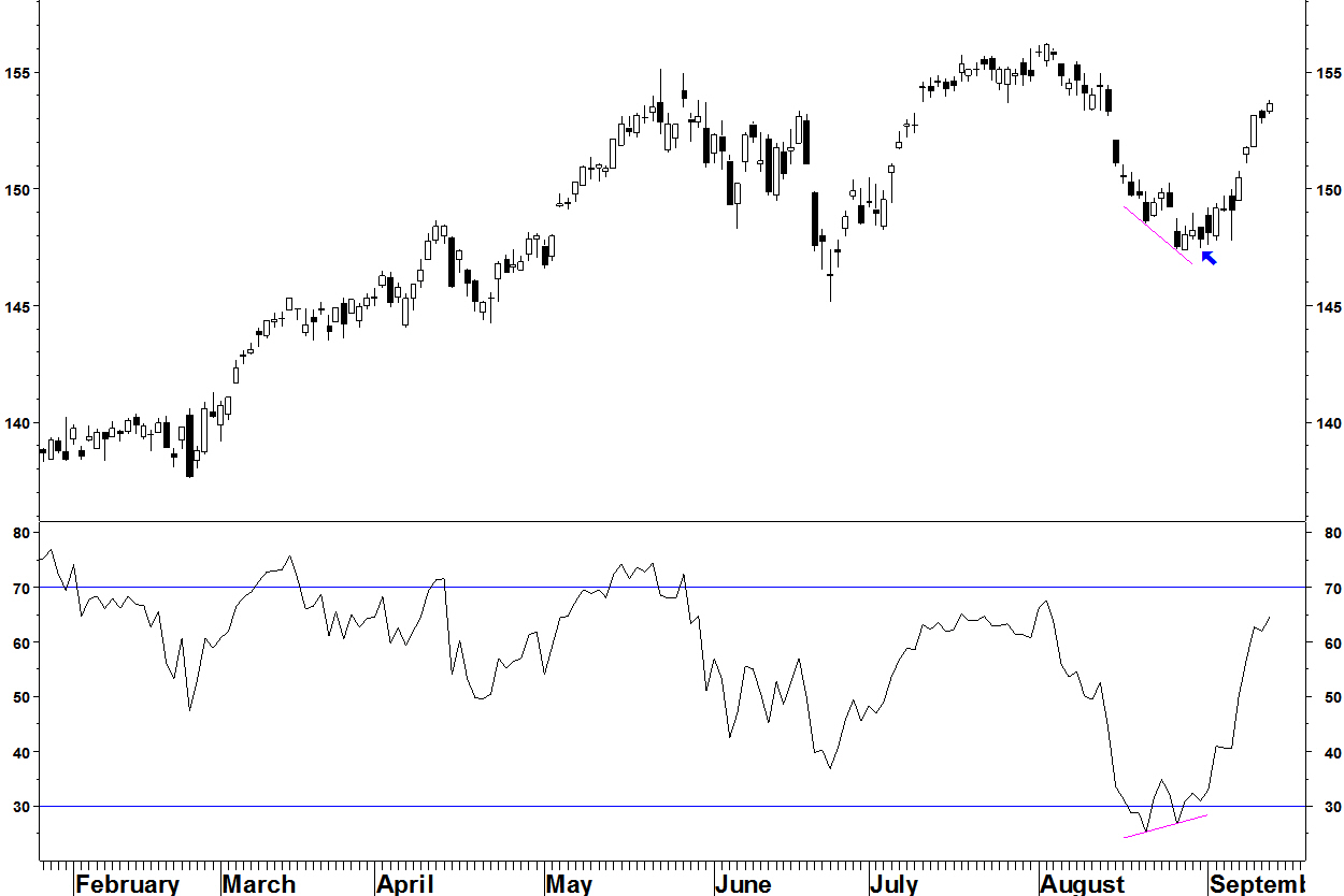 On 02 September, I showed the bullish daily divergence on the SPDR Dow Jones Industrial Average (DIA). I took half the profit as of the close of 30 August (blue arrow) and moved the stop loss to break even.