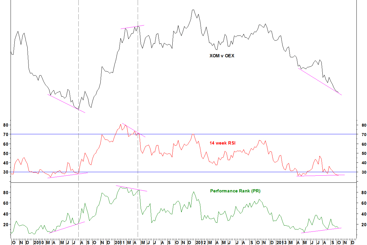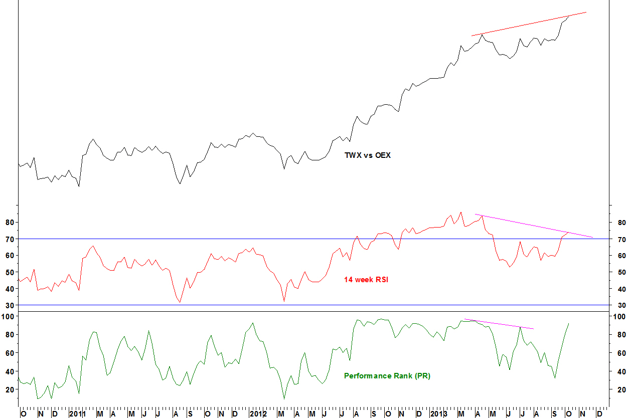 - PR divergences can confirm RSI divergences but in this case, the PR for Time Warner (its price performance ranking amongst the S&P 100 stocks) has powered higher, there is no divergence