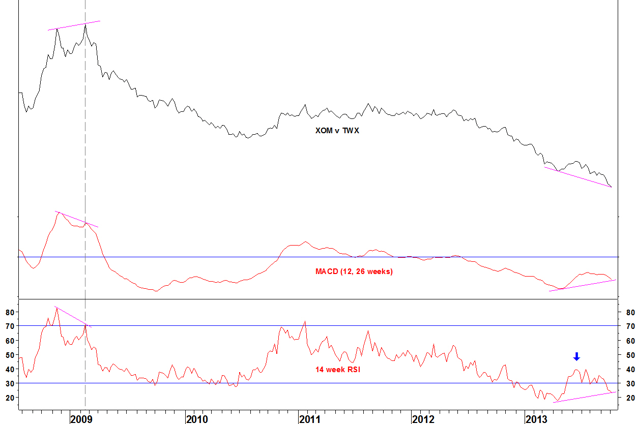 A long position in Exxon (XOM) v Time Warner (TWX) will be opened on a daily close for pair and daily RSI above the 09 October highs. The stop loss will be a new low.