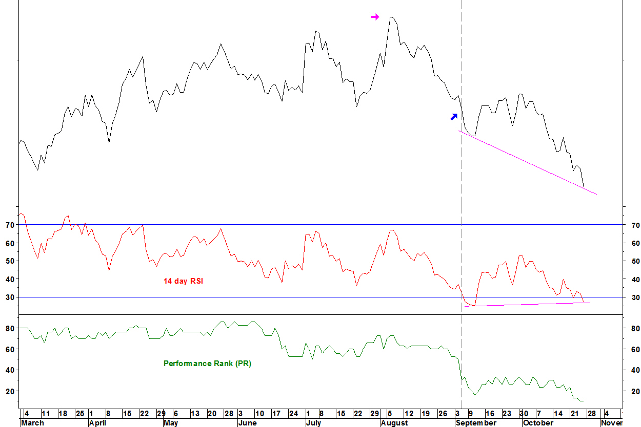 The pair took a month to work off the short term oversold condition but given the longer term RSI and PR divergences, the decline resumed.