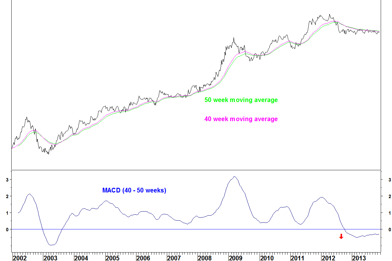 Since August 2012, the chart has traded sideways. This is a good example of why long term moving average crossovers show that something has changed but don’t give the timing of the move.