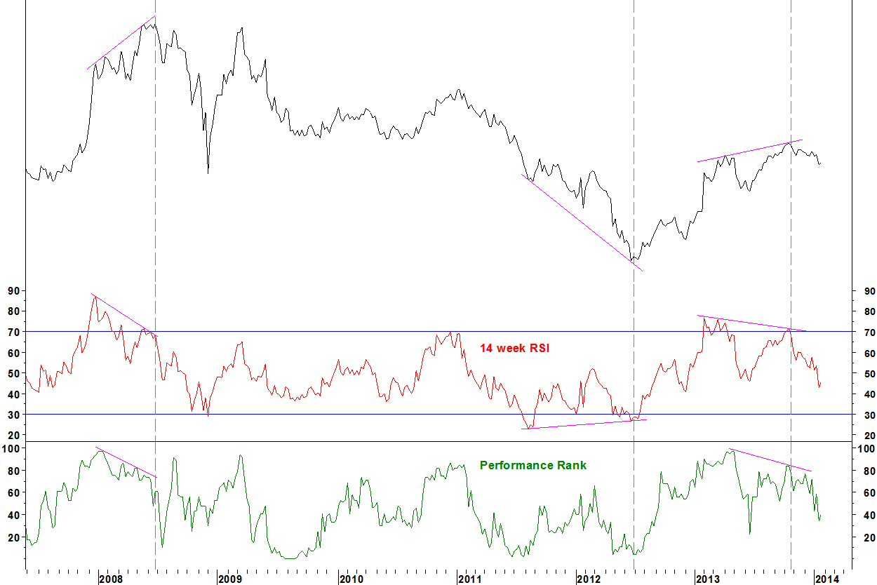 The last dashed line shows when the RSI and Performance Rank divergence were identified (in October). We may get more downside but that is not something that can be predicted through my method, which identifies the divergence set up.