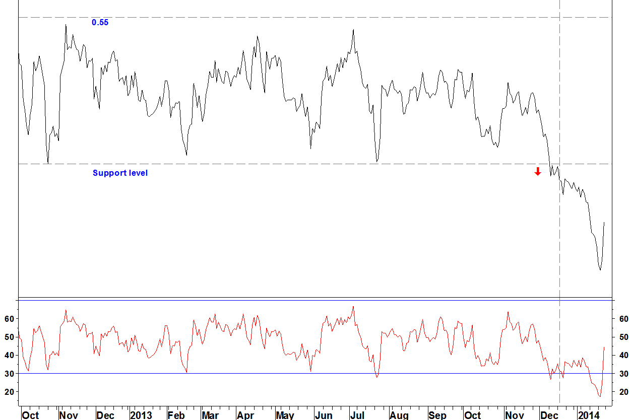 This was entered on 17 December (dashed line) on a break of relative support. The trade has progressed well but became short term oversold. The stop loss is moved to break even.