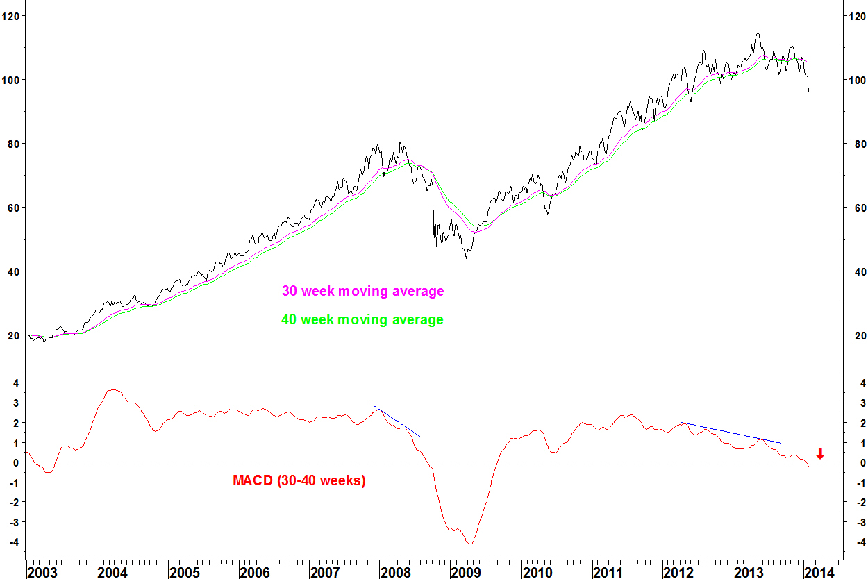 Last week, British American Tobacco (UK: BATS, US: BTI) broke support and gave the first moving average crossover on the 30 and 40 week averages since September 2009.