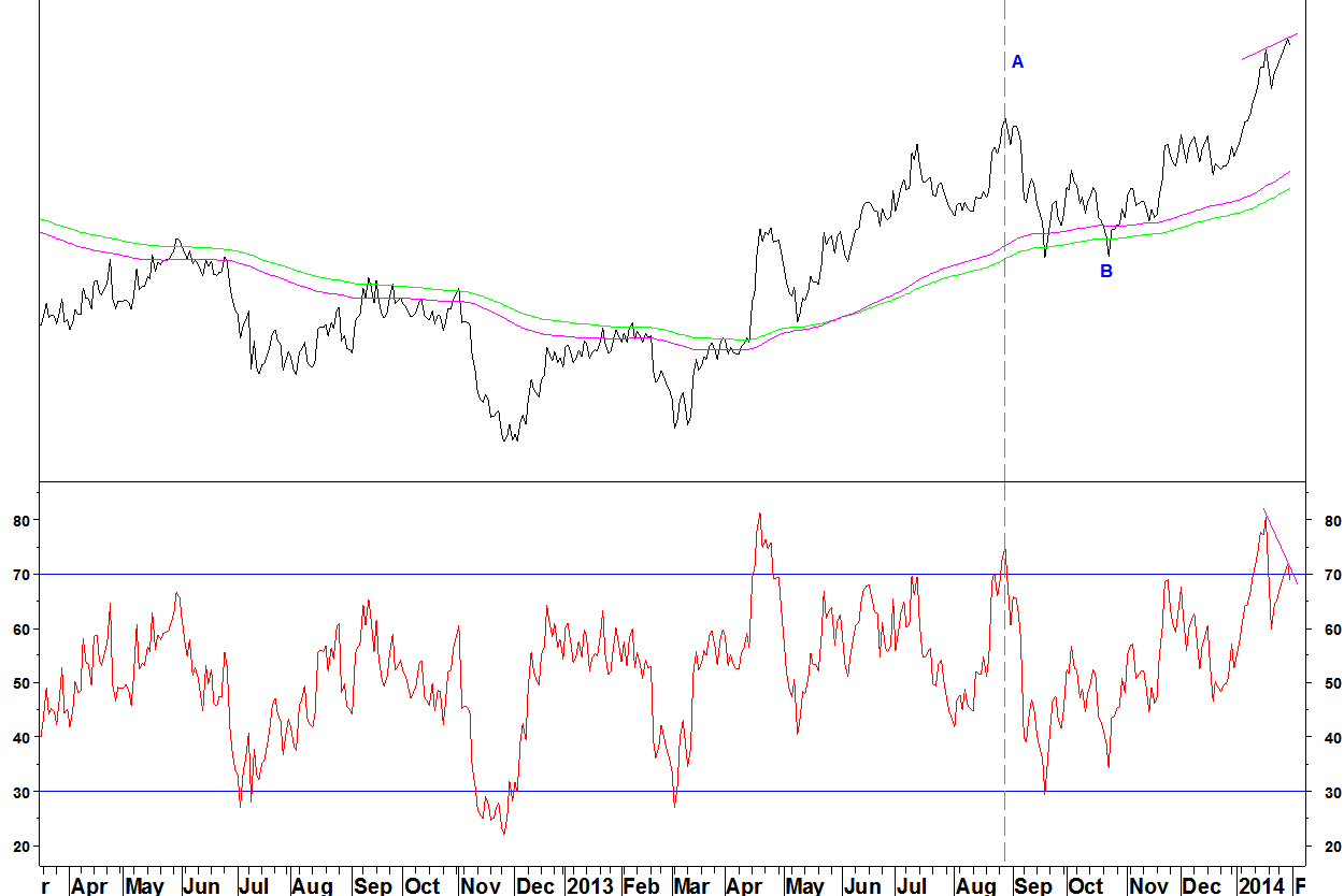 - In late August at A, the ratio and RSI peaked and it was eight weeks before the rally resumed at B