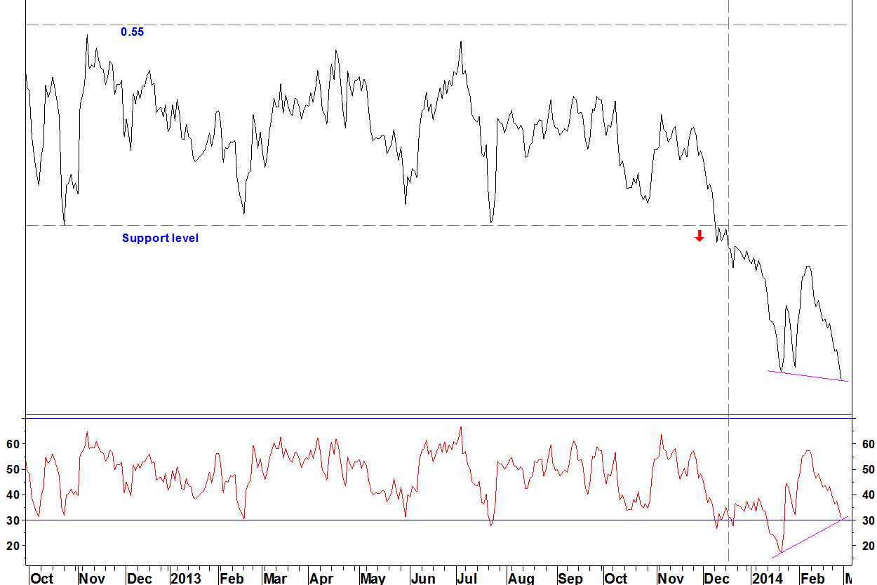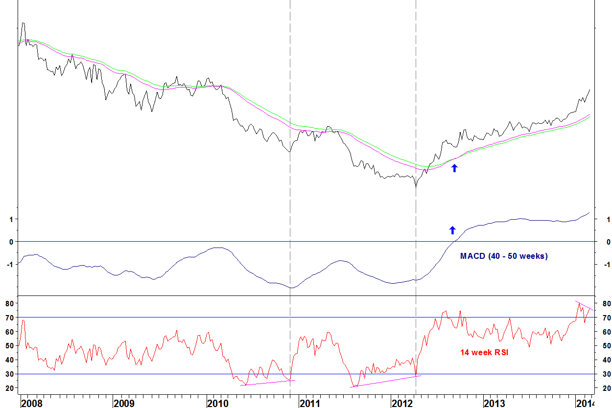 A short position in the S&P Restaurants Index versus S&P 500 Index was opened in mid December which has progressed well. Now, this trade is near to showing bullish weekly and daily RSI divergences.