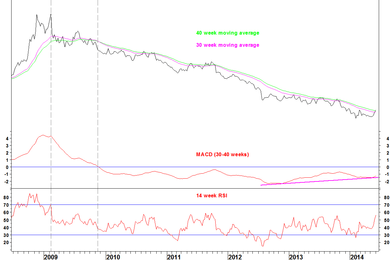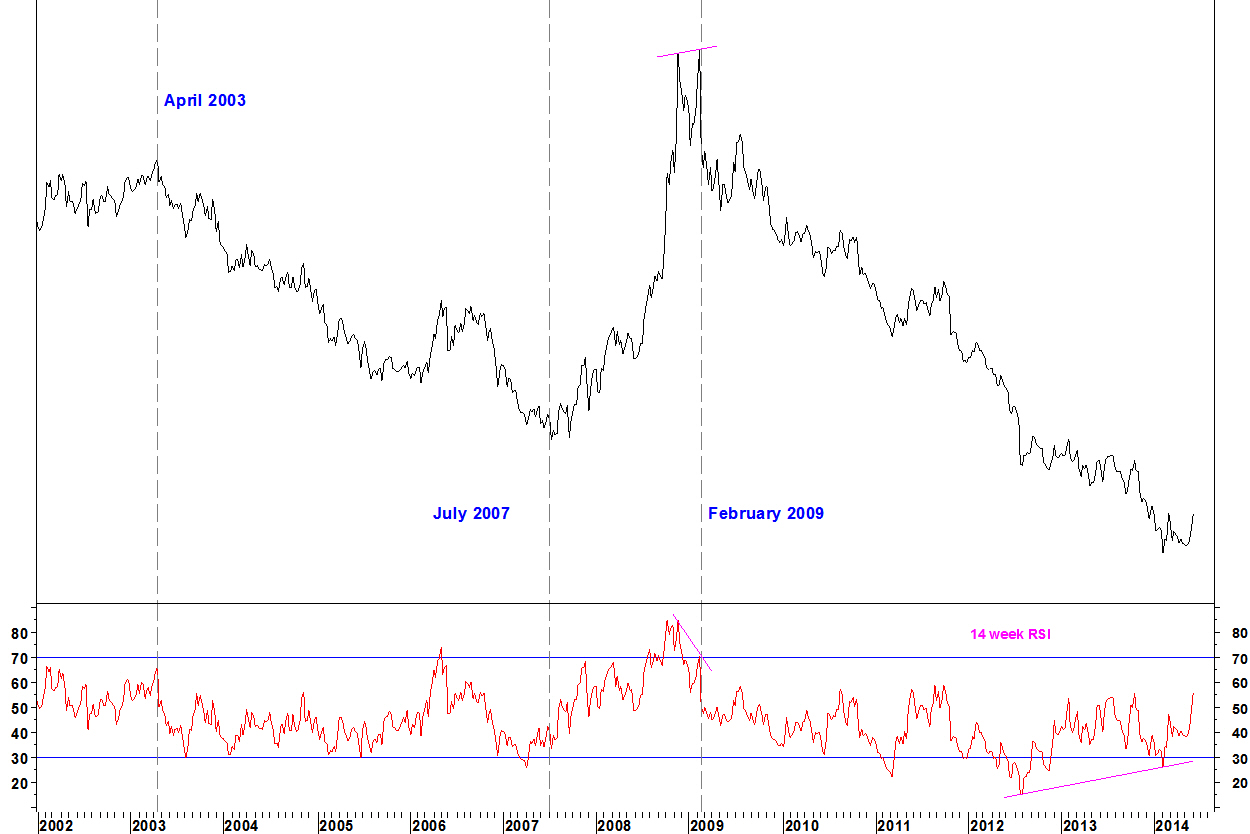 - The late 2012 bullish divergence did not stop the decline (so divergences aren’t flawless) but another RSI divergence formed in February 2014 against the summer 2012 low