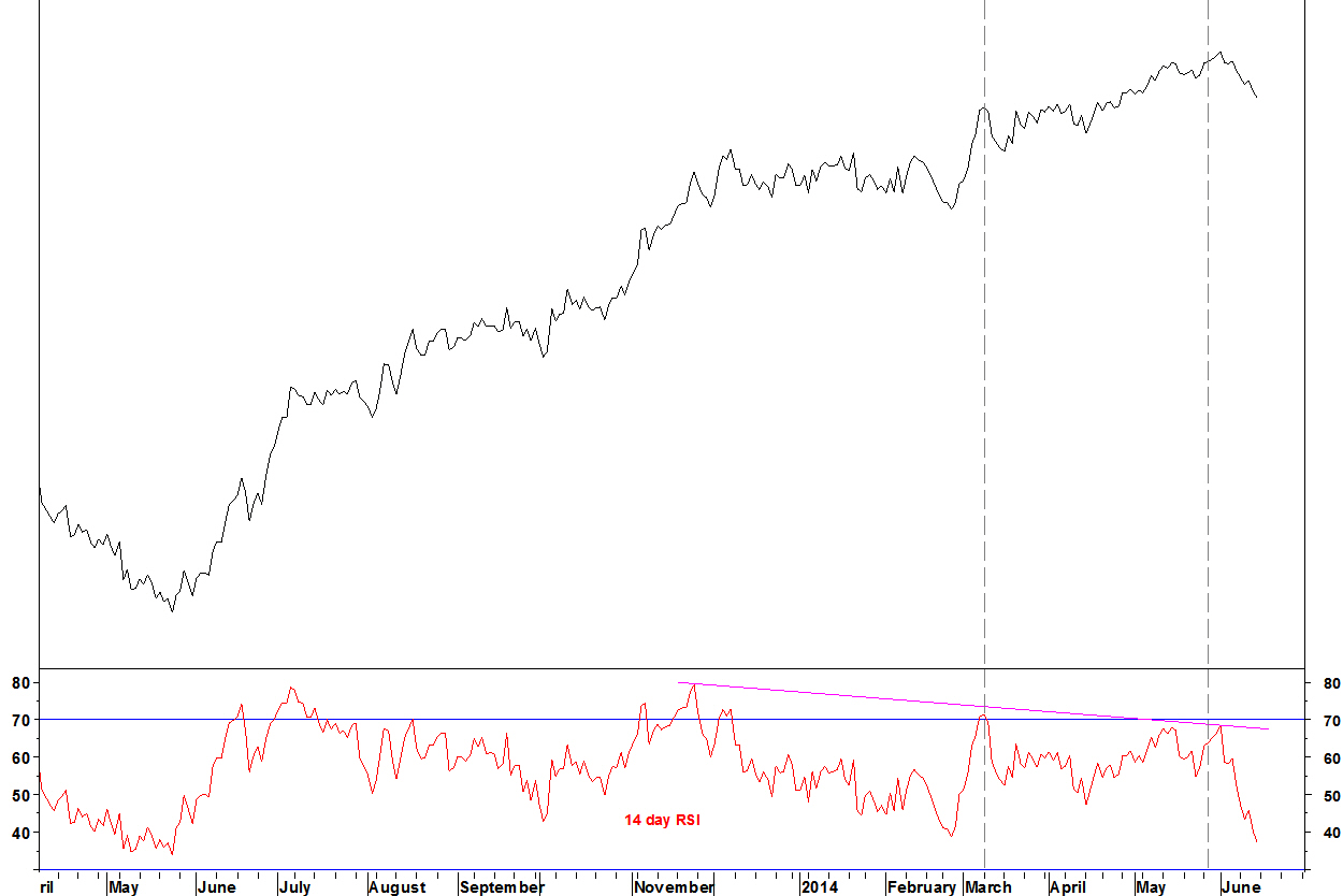 - The 14 day RSI first formed divergence above 70 in March (first dashed line) then another divergence below 70 (second line), coinciding with the weekly divergence