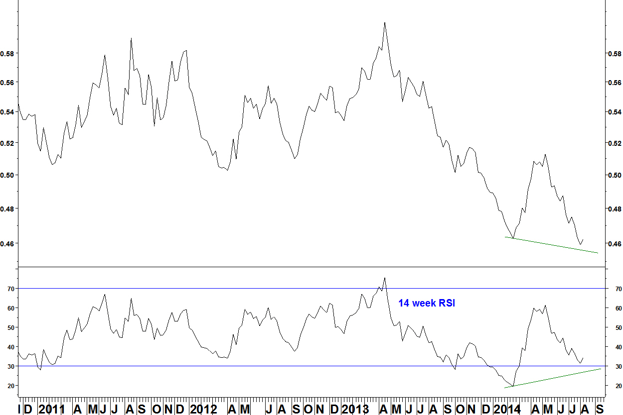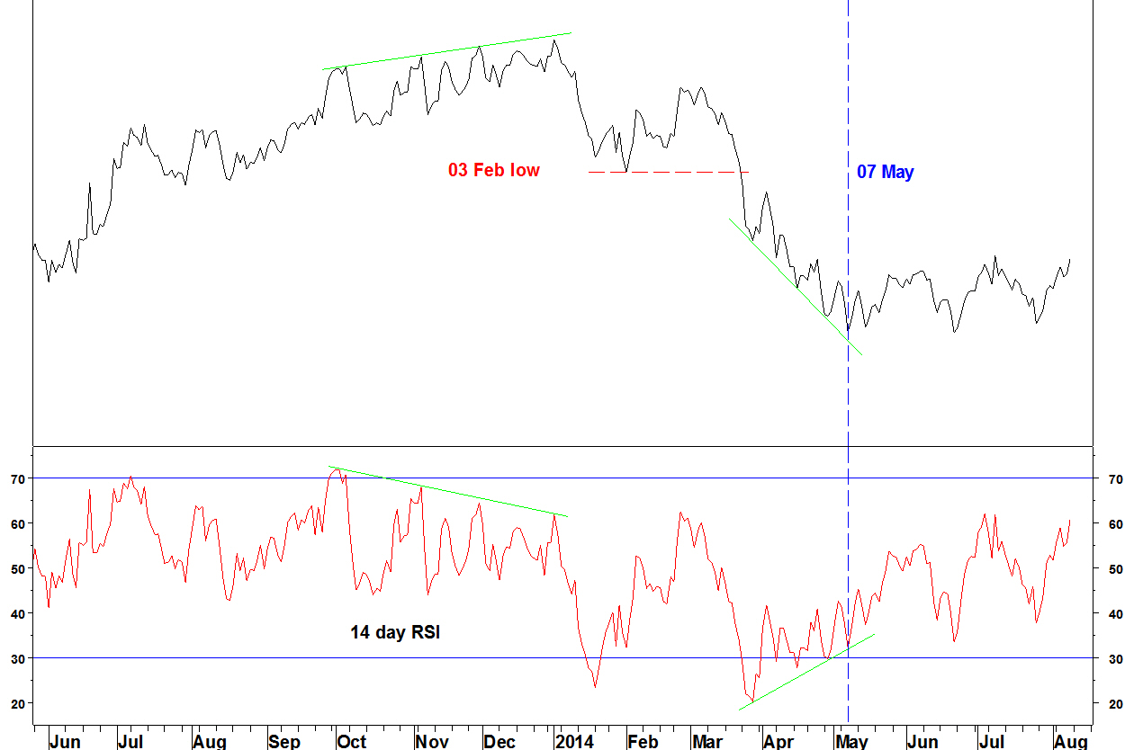 - In February 2014, there was a bullish divergence on the 14 week RSI within that move down (against the January 2014 low)