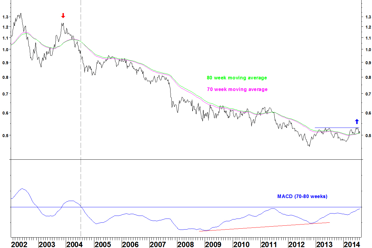 - A break above the May 2013 and July 2014 highs (blue line) will be a mark of further progress