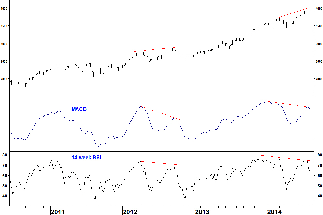 - The index formed divergences across the peaks of the 14 week RSI and the MACD in 2012, leading to an eight week decline