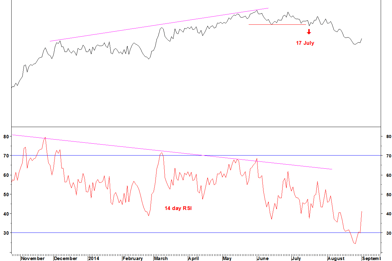 The initial entry signal was not timely but the longer term RSI and Performance Ranking divergences took effect and the pair declined up to 25 August. There has been a marginal recovery. Now, I take half of the profit (1.2% drop) and move the stop loss to break even