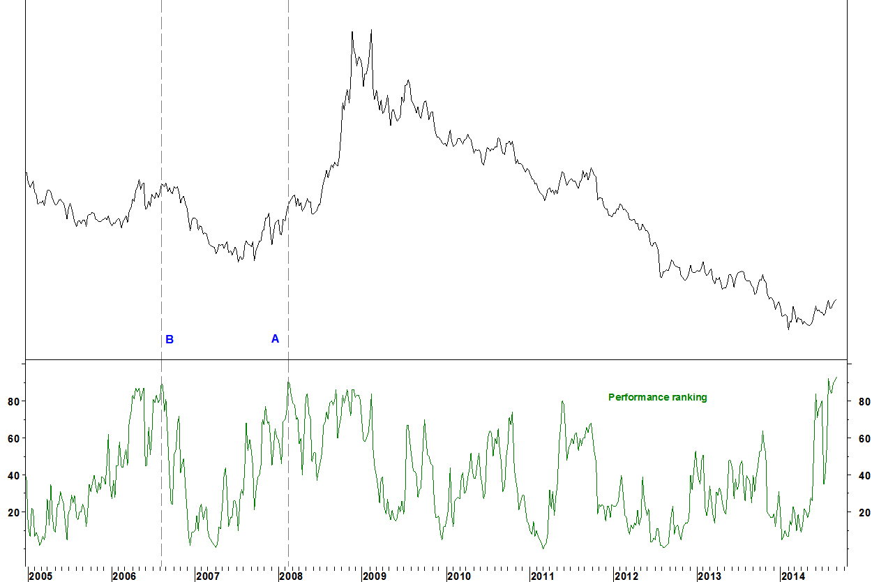 A similar PR level was reached in 2006 at B but there was not then the combination of factors (pending long term moving average crossover, previous bullish 14 week RSI divergence) that currently exist.
