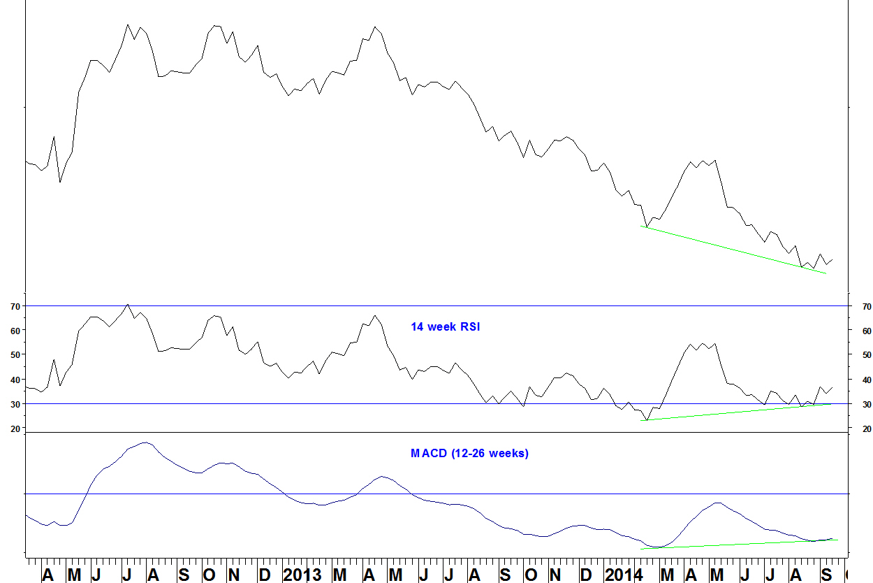 - There is bullish divergence against the February low on the 14 week RSI and the MACD