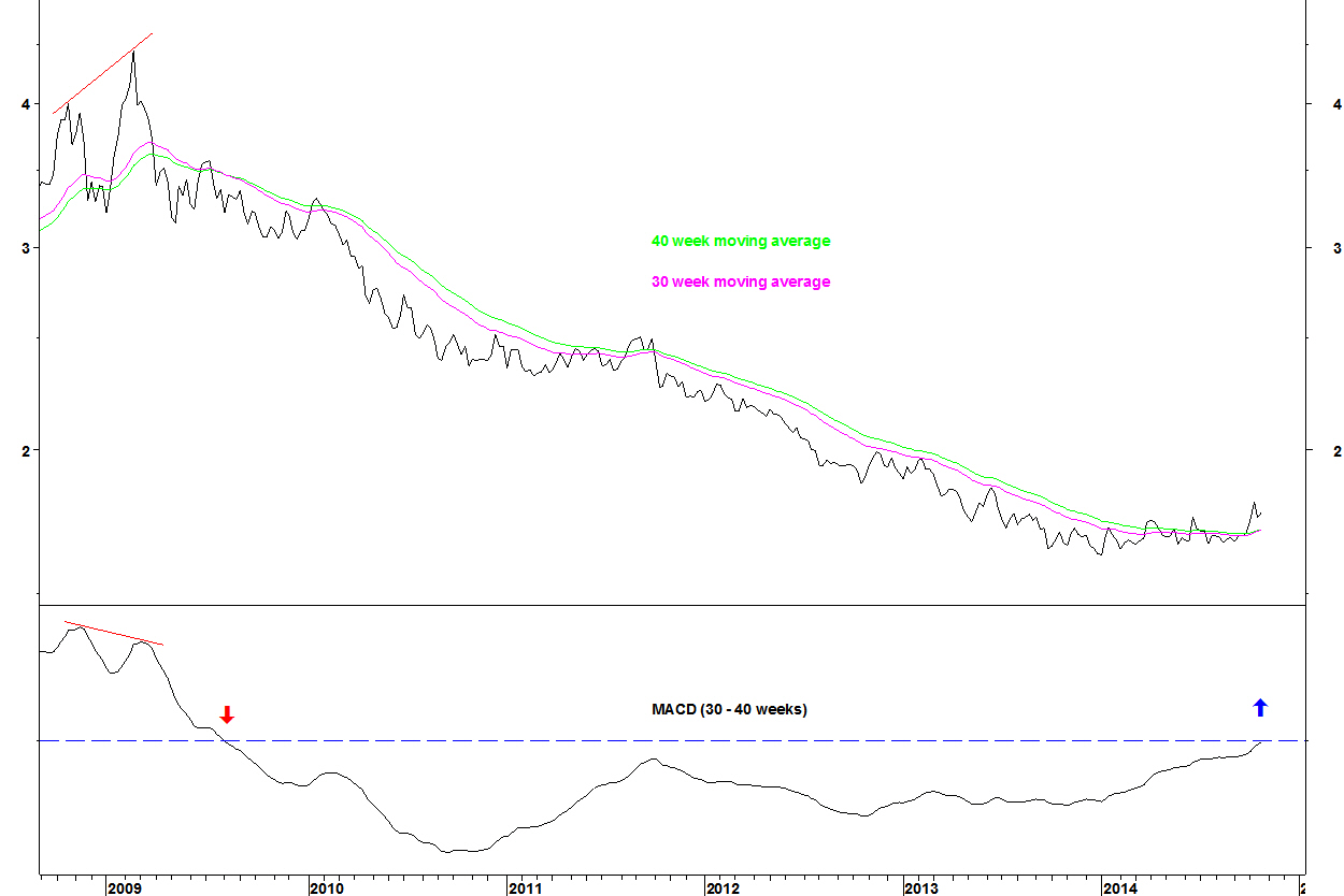 - In my long term moving average crossover method, I look for charts without a crossover for four years. The 30 and 40 week moving averages last crossed in August 2009