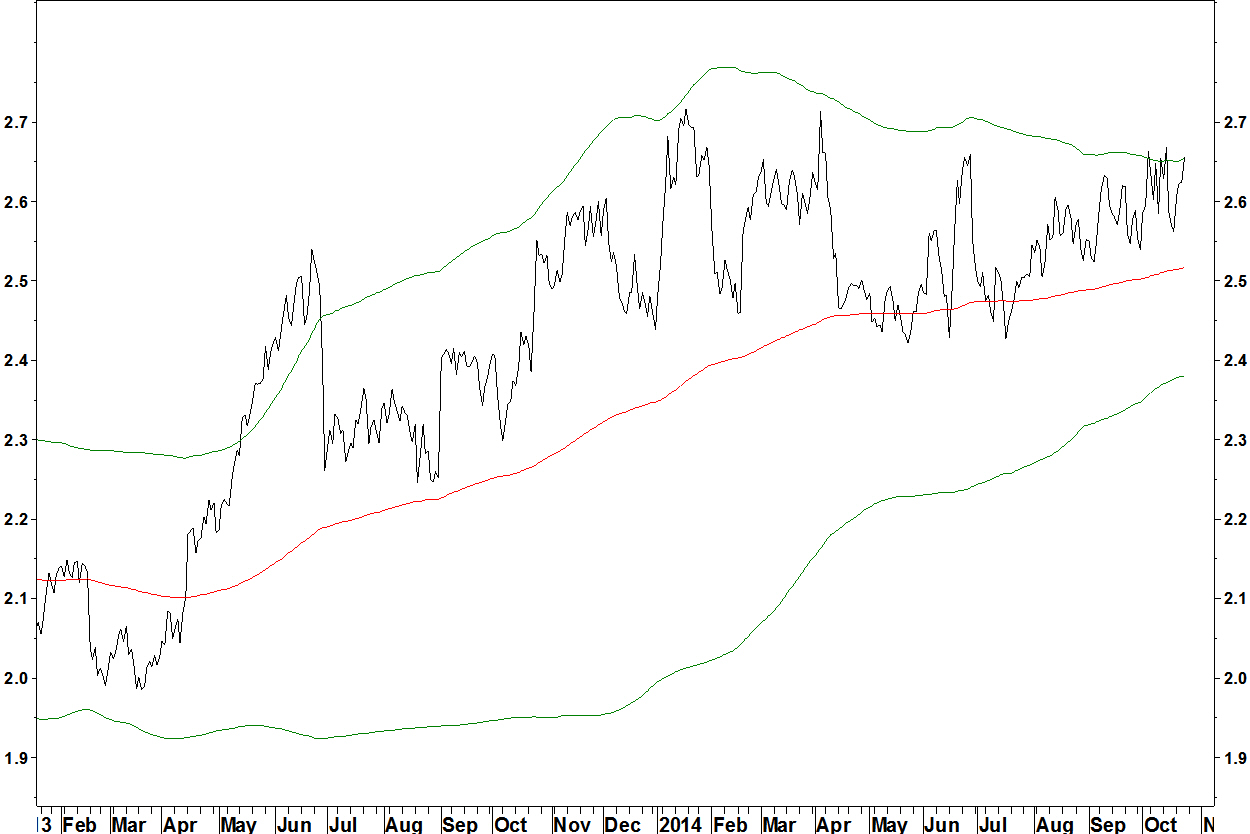 This is the same bands on a daily chart. That price has remained near the upper band during October rather than pulling back sharply from it as before, suggesting a break higher is imminent.