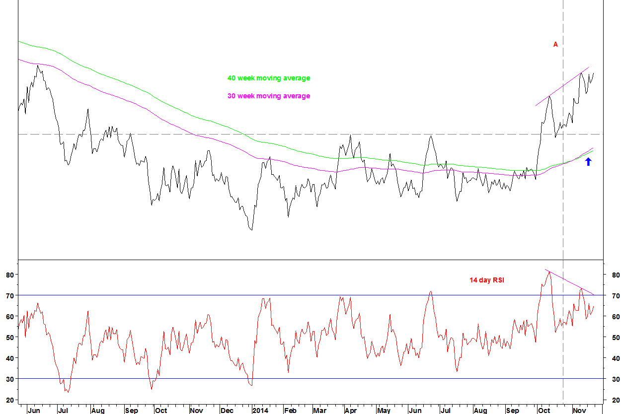 - Due to the divergence, there is likely to be a period of consolidation towards the rising moving averages but the long term trend will remain up