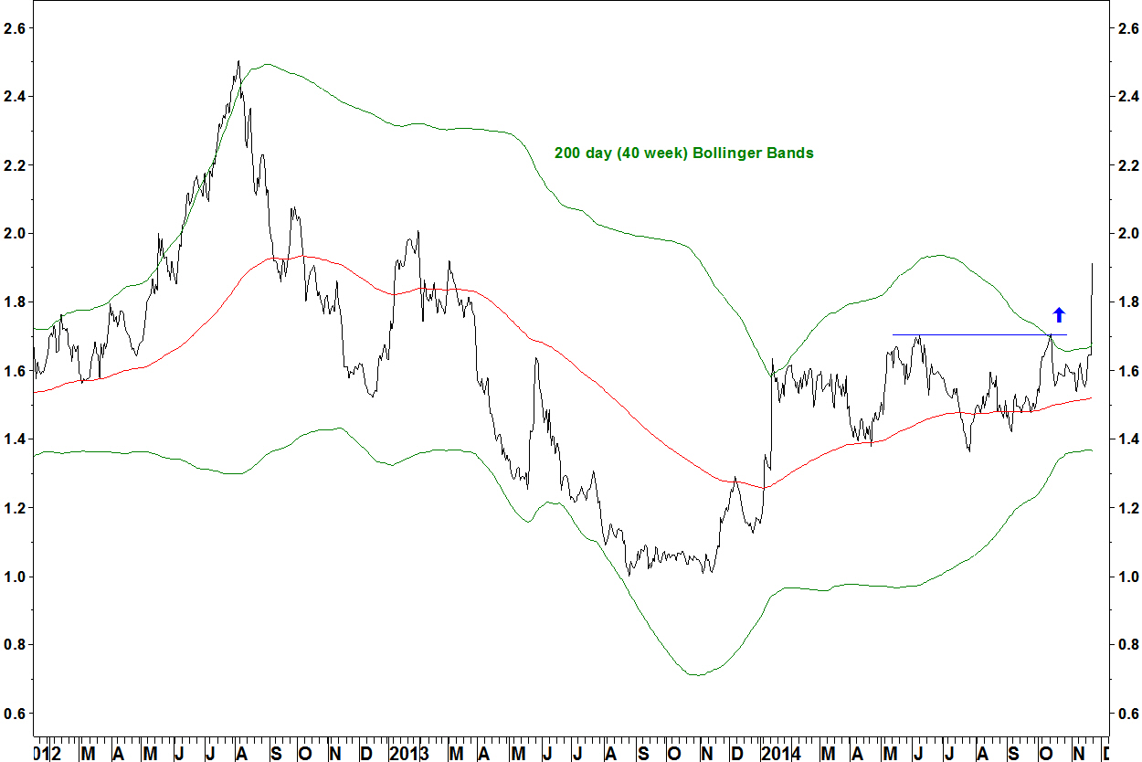 - After the consolidation since January 2014, the 50 week Bollinger Bands are at their tightest in over 3 years