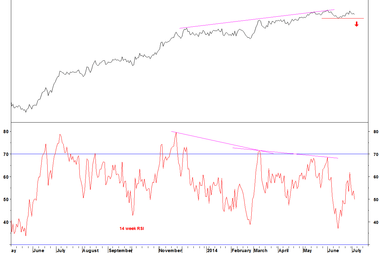 - The late May 14 week RSI bearish divergence remains in place, along with MACD divergence (not shown here)