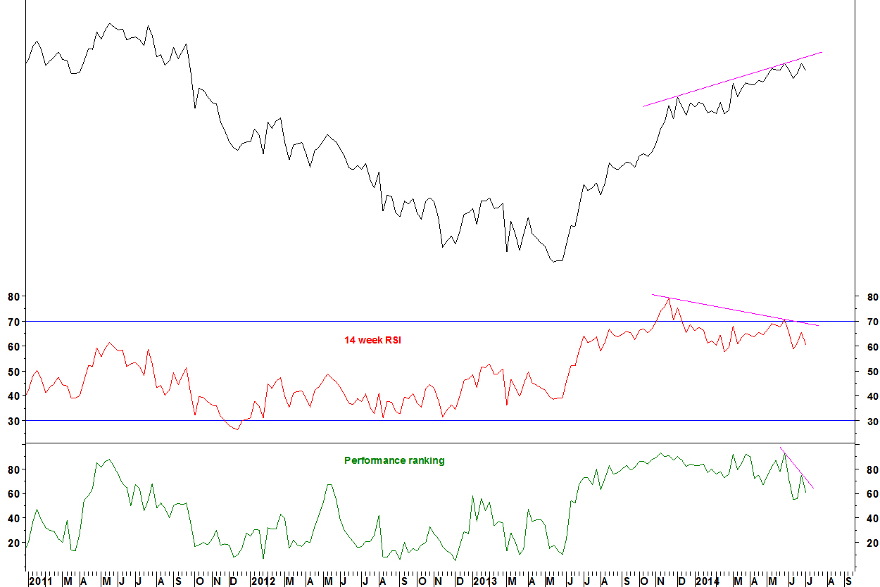 - The October 2012 relative high was formed with bearish divergence on the 14 week RSI.