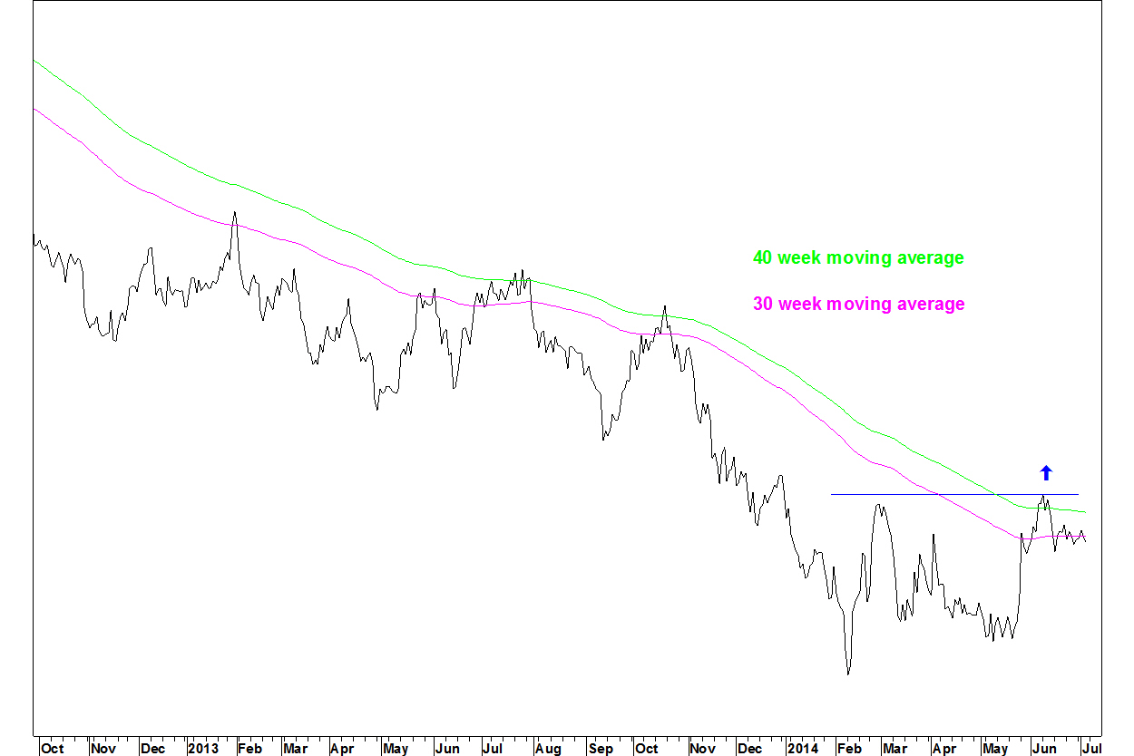 Note that a break higher is not a ‘buy signal’. Bases can take ages to develop, there could easily be a pull back lasting months. My Bollinger Band breakout method could give a signal but this works best with clearly trending moving averages, i.e. after the first consolidation above the base.